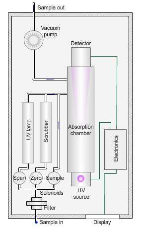 為了確定臭氧濃度,泵將環(huán)境空氣樣本通過過濾器吸入吸收室,在吸收室中,來自汞蒸氣燈的波長為 254nm 的紫外線照射樣本。