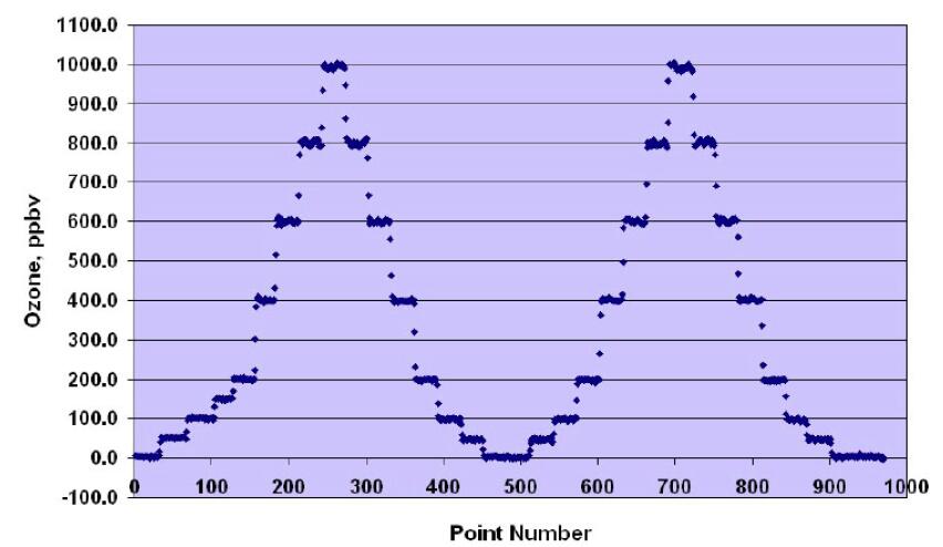 臭氧分析儀獲得的數(shù)據(jù),它以前已經(jīng)被我們一臺可NIST溯源的儀器進(jìn)行了校準(zhǔn),新的目標(biāo)臭氧濃度每5分鐘被輸進(jìn)本臭氧校準(zhǔn)源里。從數(shù)據(jù)里可以看到,新的臭氧濃度在3個數(shù)據(jù)點(diǎn)(30秒)內(nèi)被達(dá)到。濃度值被上上下下調(diào)整兩次以產(chǎn)生4條線,目標(biāo)臭氧濃度是0,50,100,200,400,600,800和1000ppbv。在左側(cè)第一組樓梯上還有額外一個150ppbv的測量。